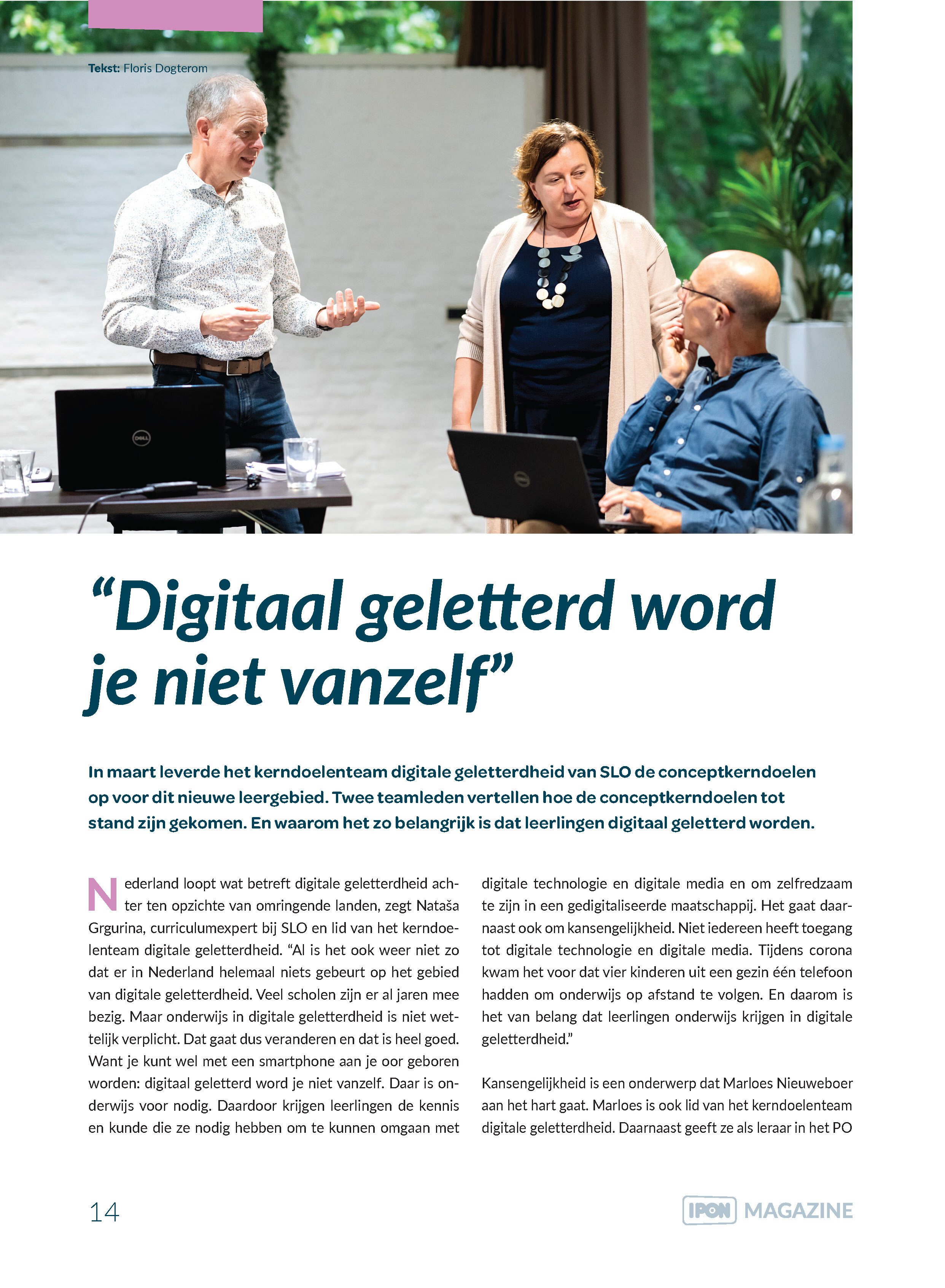 Curriculumexpert Nataša Grgurina en docent Marloes Nieuweboer zijn geïnterviewd voor een artikel in IPON magazine over waarom het zo belangrijk is dat leerlingen digitaal geletterd worden. Zij vertellen hoe de conceptkerndoelen tot stand zijn gekomen. In maart leverde het kerndoelenteam digitale geletterdheid van SLO de conceptkerndoelen op voor dit nieuwe leergebied.