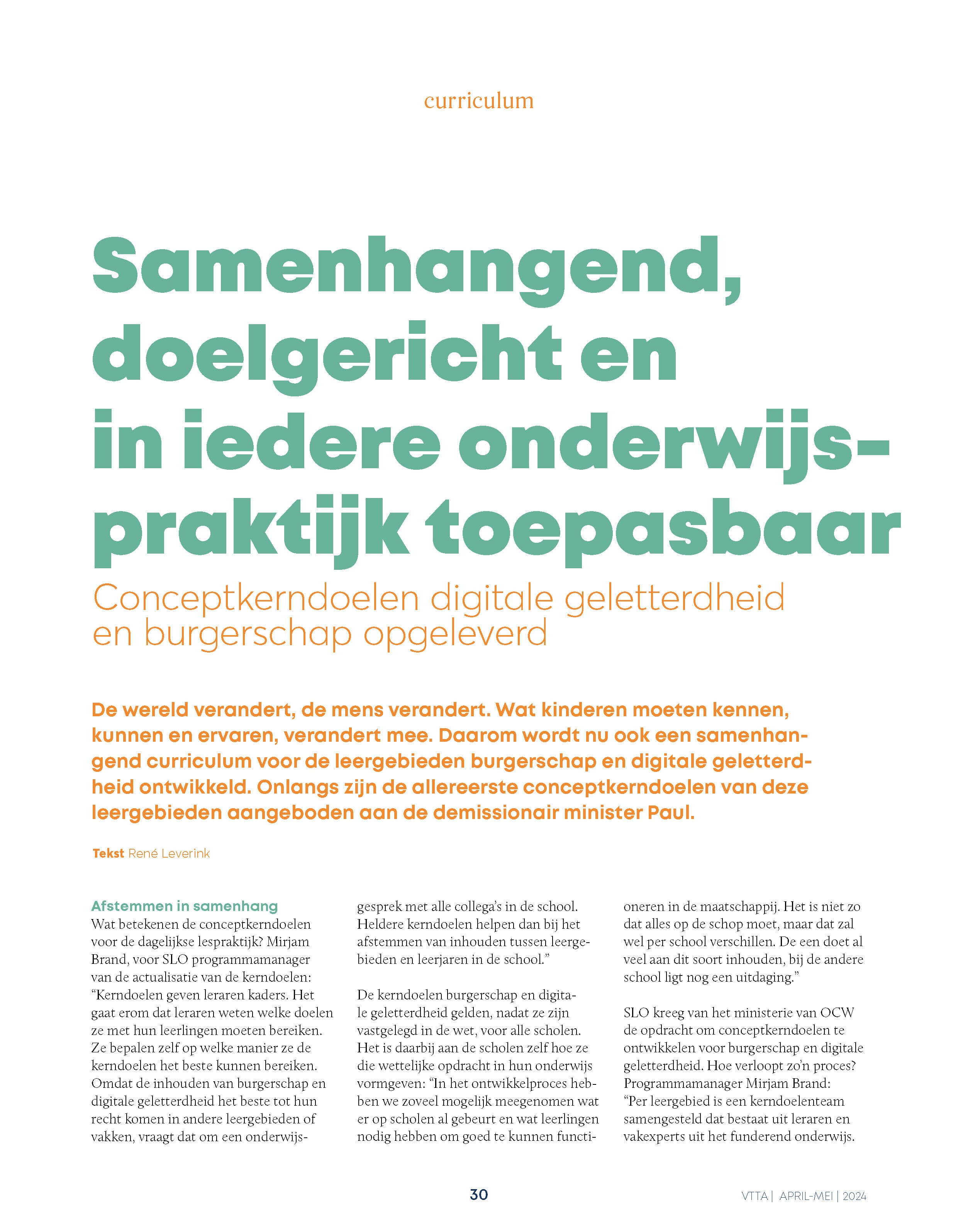 De conceptkerndoelen digitale geletterdheid en burgerschap zijn opgeleverd in maart 2024. De wereld verandert, de mens verandert. Wat kinderen moeten kennen, kunnen en ervaren, verandert mee. Daarom wordt nu ook een samenhangend curriculum voor de leergebieden burgerschap en digitale geletterdheid ontwikkeld. Onlangs zijn de allereerste conceptkerndoelen van deze leergebieden aangeboden aan de demissionair minister Paul.