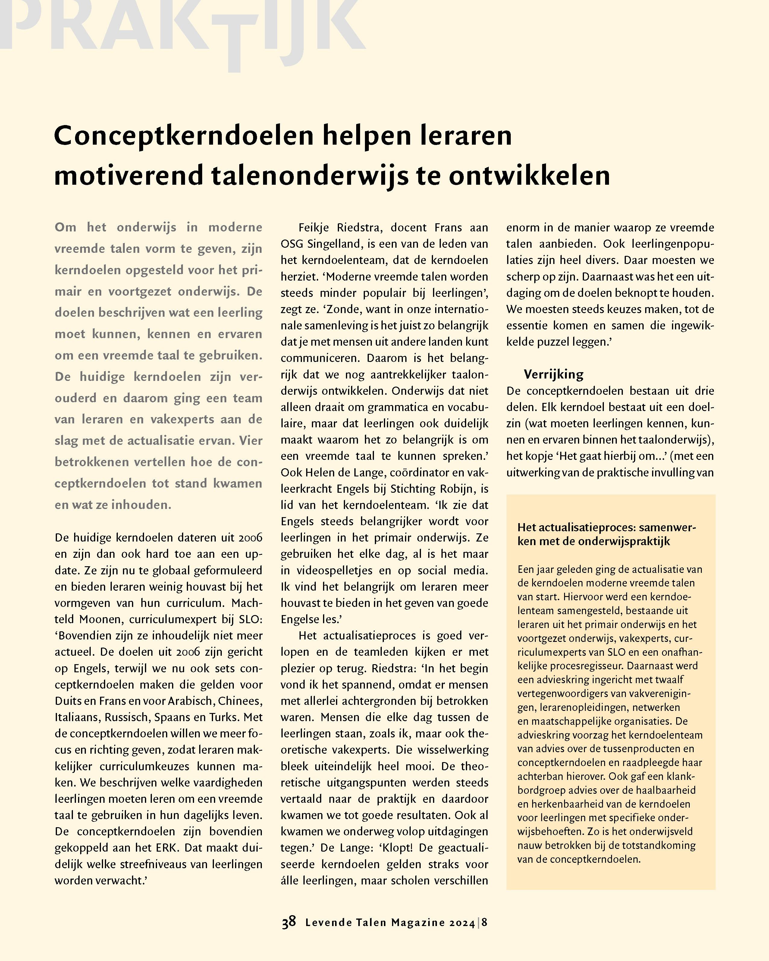 In dit artikel, gepubliceerd in Levende Talen Magazine eind 2024, lees je ook over de totstandkoming van de conceptkerndoelen, het samenwerken met de onderwijspraktijk, taal- en cultuurbewustzijn en de samenhang met het actualiseren van de examenprogramma's.